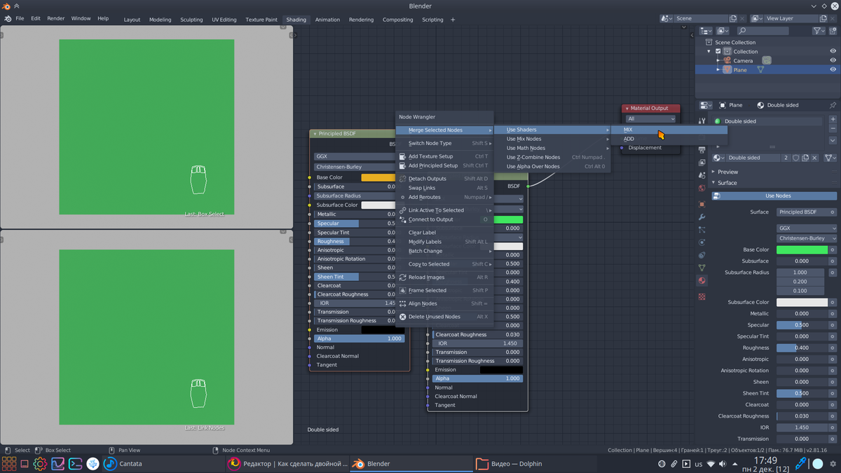 Ну так вот перейдём значит к решению вопроса. Для этого создадим один материал, да вам не понадобиться два. Назовём его к примеру Double sided. После открываем вкладку Shading. Кликаем по шейдеру Principiled BSDF и по Shift+D создаём копию.