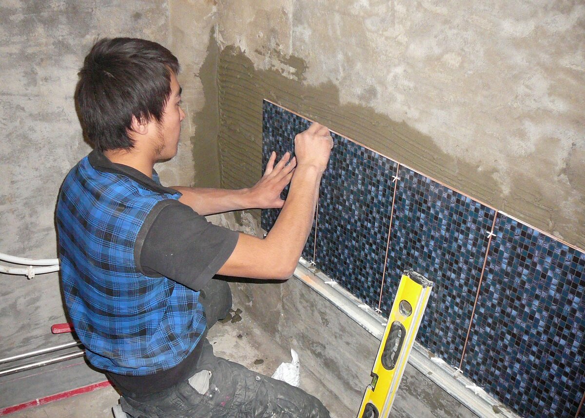 Как делается. Технология укладки плитки. 1. Покупается плитка. Плиточный клей, затирка и прочее. 2. Производиться демонтаж старой плитки, ванны, раковины и тд. Стену нужно зачистить до идеального состояния, если стены ровные и не предполагается выравнивания и штукатурных работ. Если стены кирпичные и оштукатурены непонятной осыпающейся штукатуркой необходимо отбить ее до основания до самого кирпича. 3. Производятся сантехнические работы. Замена труб на металлопластик или полипропилен под заглушки. Трубы укладываются с учетом будущей плитки. 4.Выравнивание стен. Рекомендуется гипсовая штукатурка по маякам. 5. Сама укладка плитки. Укладка керамической плитки включает несколько этапов. Размешиваем плиточный клей, согласно инструкции, написанной на мешке. Примерно раскладываем плитку по стенам и полу. Составляем представление о том как будут проходить швы, прирезка к полу, потолку, ушлам, ванной и раковине. Учтите высоту декоративного бордюра Стреляем горизонталь. Можно ее отбить (начертит