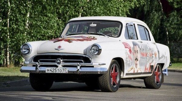 Легендарную «Волгу» превратили в невесть что – автомобиль на дорогих узлах и агрегатах изменился до неузнаваемости. В первую очередь нужно отметить достаточно нетипичную аэрографию почти по всему кузову ГАЗ-21 «Волга». Автомобиль по бокам «украсили» портретами Сталина и советского народа, а для полноты картины, даже колёсные диски оказались оформленными в аналогичном стиле. Дорогие тормозные колодки Brembo, качественная резина и диски в форме красных звёздочек, украшенных стразами – всё говорило о том, что у автора тюнинг-проекта старой «Волги» предостаточно средств для того, чтобы оснастить автомобиль совершенно любыми аксессуарами, о чём, в частности, свидетельствует тот факт, что построен ГАЗ-21 по сути с нуля, на базе Porsche Cayenne. От прославленного «Порша» автомобиль получил шасси и некоторые элементы интерьера, в частности – дорогую обивку и переднюю панель, а вот кузов и большая часть салона здесь классические, и принадлежат «Волжанке». Разве что из-за того, что у Porsche C