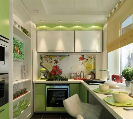 Кто сказал, что в маленькой кухне не может вместиться вся любимая техника? Этот дизайн - яркое тому опровержение!) Разберем его более детально "от пола до потолка": Первое, что привлекает наше внимание, это яркий фартук, а под ним большая варочная панель на четыре конфорки. В маленьких кухнях, как правило, устанавливают варочную панель на две конфорки с целью экономии рабочей поверхности. В данном дизайне-проекте вопрос с варочной панелью и рабочим пространством решили иначе и, на мой взгляд, очень удачно, что не может не радовать, если Вы-любитель поготовить. Далее, как раз та самая рабочая поверхность, а-ля обеденный столик. Соглашусь, что жертвование подоконником, ради увеличения пресловутой рабочей поверхности тема приевшаяся. Но обратите внимание, в этом дизайн-проекте подоконник все же остался подоконником, хоть и ширина его стала ровно с оконный проем. Также весьма удачно расположена раковина по отношению к варочной поверхности - при таком взаимном расположении нужно очень и оче