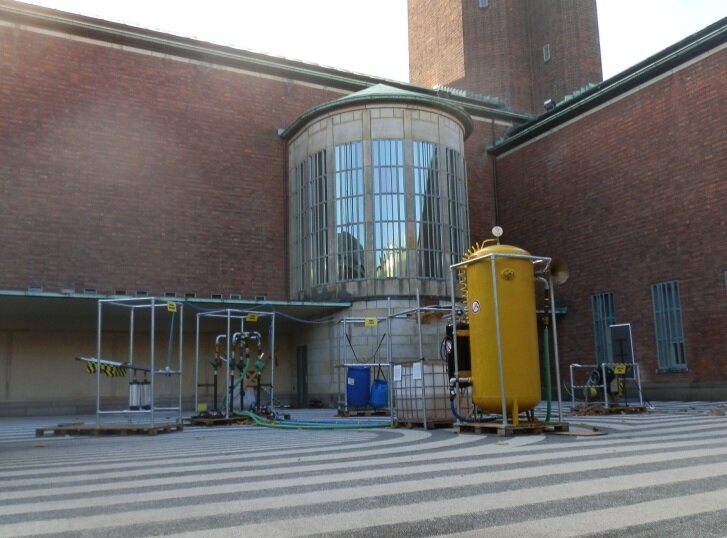 Таким образом, в МЭС были задействованы старые добрые технологии, которые в XIX веке использовались в централизованных высоконапорных гидравлических сетях Антверпена, Лондона, Мельбурна, Буэнос-Айреса и других крупных промышленных городов. Для поддержания постоянного давления в сети применялись гидравлические аккумуляторы. Впрочем, Мелле Сметс и Крис де Декер пошли дальше, дополнив гидравлический аккумулятор пневматическим. Пока одни «человеческие движители» руками тянут за рычаги, качая воду в гидроаккумулятор, другие с помощью ножных автомобильных насосов увеличивают давление воздуха в газовом баллоне.