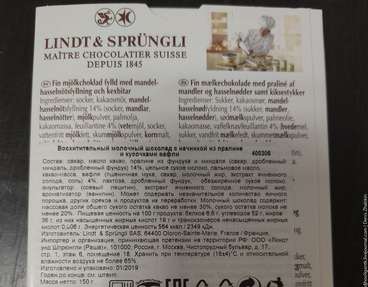 Внутри - вафельные прослойки с дробленым фундуком в пралине. Вкусно на самом деле. Пралине - это вообще один из моих любимых конфетных вкусов (вспомните бельгийсикие "морские фигуры"). А тоненькие прослойки вафли тают во рту вместе с остальным. Рекомендую! Просто отличный шоколад.