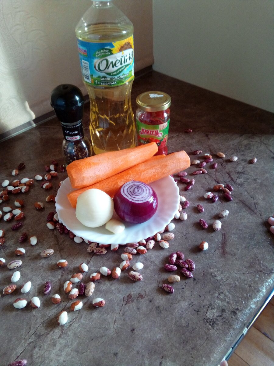 Всегда готовлю его , когда хочется разнообразия. Полезный и вкусный салат . Можно есть его с хлебом или подать с каким - нибудь гарниром. Даже можно пюрировать и подавать , как паштет. Зальем фасоль водой и оставим на ночь. Приготовим овощи : морковь натрем на мелкой терке , лук и чеснок порубить,с помидора снять кожицу и мелко порезать . Фасоль промыть , варить до готовности , около часа. При варке фасоль солить не будем. Овощи потушить на сковороде минут 10-15. Добавим соль , черный перец или смесь перцев. В овощи выкладываем готовую фасоль и томатную пасту. Заливаем водой и тушим закрыв крышкой , на среднем огне 10 минут. Понадобится: Фасоль - 200-250 гр. Лук репчатый - 2 вида , красный и обычный лук Помидор -1 шт. Морковь - 1 шт. соль , перец , масло растительное , паста томатная.