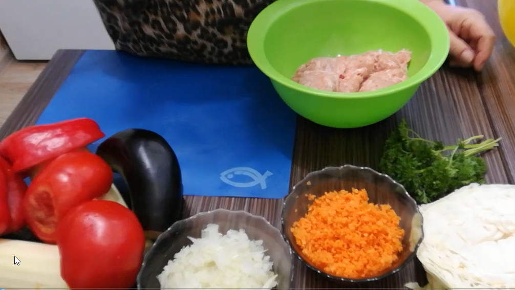 Для приготовления блюда нам понадобится: 1.Кабачки 2.Болгарский перец 3.Свежие помидоры 4.Баклажаны 5.Кабачки 6.Репчатый лук 7.Морковь 8.Свежая капуста 9.Зелень 10.Любой фарш 11.Соль, перец,специи И так начнем делать. Нарезаем все овощи и отправляем на разогретую сковороду. Добавляем порезанную кубиками морковь и лук. Все перемешиваем, солим, перчим и накрываем крышкой для тушения Пока тушится рагу переходи готовить фарш.( фарш можно любой).В фарш добавляем промытый рис (рис не варить) одно сырое яйцо и рубленный лук, солим, перчим Все вымешиваем и даем фаршу немного постоять Далее делаем тефтельки и укладываем на сковороду по краю раздвигая рагу Добавляем немного кипяченой воды и закрываем крышкой.В конце можно выдавить чеснок и добавить зелень Подробней можно посмотреть видео