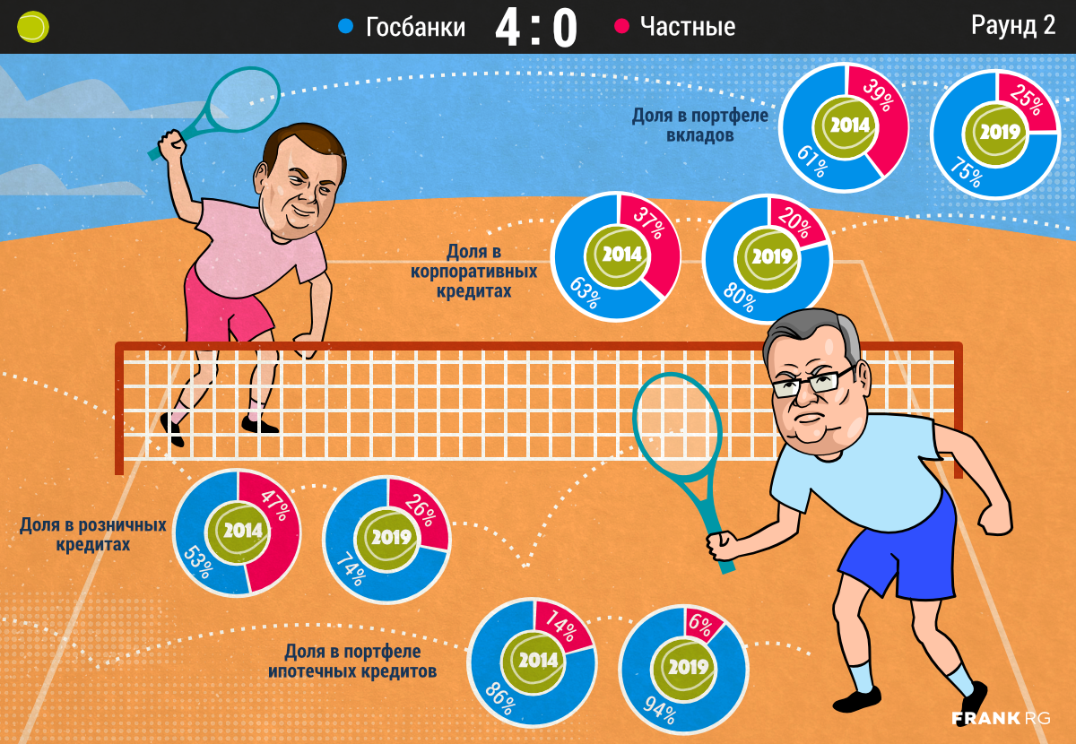 Frank Media публикует банковский инфографический комикс «Госбанки vs частные». Второй раунд: За последние пять лет доля госбанков выросла практически во всех сегментах бизнеса. Из слайда видно, что сильнее всего — в розничном кредитовании (почти на 40%). «Розница остается наиболее привлекательной с точки зрения доходности в условиях снижения маржинальности банковского бизнеса», — отмечает управляющий директор по банковским рейтингам Эксперт РА Александр Сараев. Генеральный директор Frank RG Юрий Грибанов указывает на нерыночные преимущества, которые имеют госбанки перед частными. В первую очередь, это доступ к дешевому фондированию, позволяющий предлагать более выгодные ставки по ипотеке. "Также это зарплатные проекты в бюджетной сфере и госкорпорациях, дающие доступ к клиентам, к информации об их денежных потоках и, как следствие, позволяющие более эффективно продавать им кредитные продукты", - поясняет Грибанов, добавляя, что разворот рынка в сторону роста доли частных банков будет