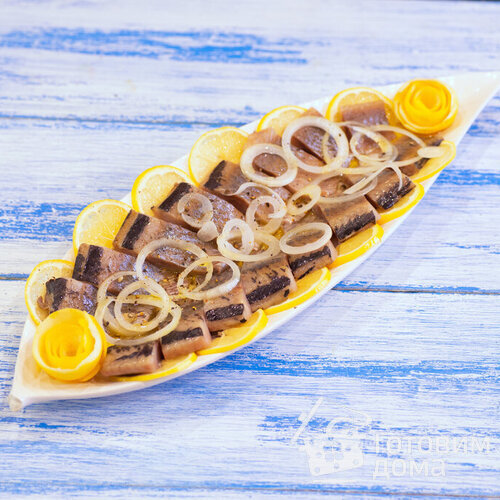 Кладем в селедочницу и украшаем лимончиком, колечками лука, сбрызгиваем лимончиком или уксусом, смотря что предпочитаете, поливаем маслицем, пару цветочков из кожуры лимона, для настроения, и немного свежемолотого перчика. Готово!