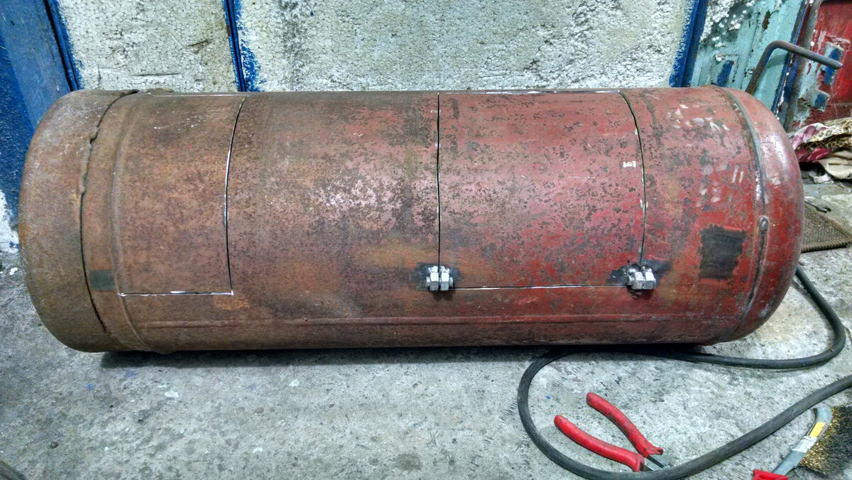 Приветствую всех.Вот как то пару месяцев назад решил замутить буржуйку из двух пропановых баллонов.Но всё руки не доходили, а после передумал делать из двух, т.к места в гараже и так не хватает.Второй баллон оставил под пескоструй в будущем.В общем слепил за пару недель ноября(по 2-4 часа в день) лепил как фантазия позволила))Колосник сделал разборной, для удобства установки, дабы голову баллону не отрезать(как некоторые делают).Канты на двери сделал с защиты ДВС 2мм толщиной.Ноги из шпилек ГБЦ 12мм.Навесы из болтов/гаек м10.Еще хочу типа стол/полку из пластины 5-6мм над баллоном приварить, который будет держаться на уголке к стене по периметру. В процессе постройки принимали участие:Защита ДВС от Ваз 2109.Лист 1мм(немного)Шпильки ГБЦ от той же 2109.Крыша от Ваз 2109.Сколько ко то килограмм болтов/гаек.Пластина металлическая 6мм(сварил из двух шт. и вварил в верх баллона.Ключи гаечные( 2шт)Трубы 1 дюйм и 100мм на выхлоп- арматура и т.д. П.С. Двери, ручки и т.д не чего не болтается, всё
