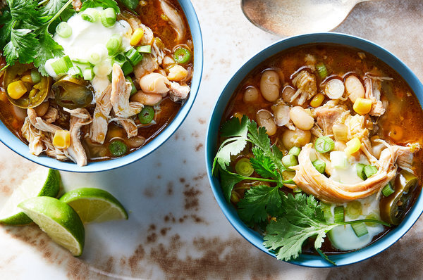 ИНГРЕДИЕНТЫ: * 3 столовые ложки несоленого масла * 1 крупный желтый или красный лук, мелко нарезанный * Морская соль * 10 зубчиков чеснока, мелко нарезанных * 1 халапеньо, фарш * 3 -4 шт. нарезанного зеленого чили * 2 чайные ложки молотого тмина * 2 чайных ложки лукового порошка * 1 чайная ложка сушеного орегано * 400 гр куриных бедер без кожи, без кожи * 3 чашки куриного бульона * 2 банки больших белых бобов без соуса * 1 ½ чашки замороженной кукурузы * 1 чашка мелко нарезанной свежей кинзы (около 1 маленькой связки), по желанию * 1 лайм, сок (около 2 столовых ложек) * Маринованные ломтики халапеньо, нарезанный зеленый лук, кубики авокадо и сметана, для сервировки Приготоаление: 1. В большой сковороде растопите масло на среднем огне. Добавить лук, приправить солью и жарить, периодически помешивая, пока лук не станет мягким и прозрачным, около 8 минут. Добавить чеснок и халапеньо и варить до готовности, около 1 минуты. Добавить нарезанный