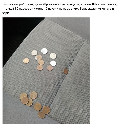 Всем привет.Уважаемые таксисты вам часто дают наличные мелочью?) У меня такое бывает довольно часто:)Было даже такое ,что 200 рублей.Там почти 200 рублей.Примерно 176 Рублей было .Дали мелочью. Я конечно иногда бываю зол)Когда очень много мелочи накапливаются. Никогда мелочь не считаю.Всегда бросаю в кучу с мелочью. В основном в Санкт-Петербурге культурнее люди.После того как дают деньги мелочью извинются.Мол простите ,купюры не было. Тут на картинке мы видим ,что Водитель не доволен.Наверное это в Москве.В Санкт-Петербурге в основном пассажиры очень культурные.Очень часто оставляют чаевые. Я считаю ,что мелочь это не проблема.Это ведь тоже деньги.Конечно я стараюсь от них как можно быстрее избавиться. Если раньше можно было брезгать мелочью.Сейчас этого точно не надо делать.Тем более эту мелочь можно положить в копилку.В конце года вы будете увидены сколько бы заработали. Если даже подсчитать по 100 рублей в день.То в месяц 3000 рублей.В год уже 34000 Рублей.Что очень хорошо;) Ос