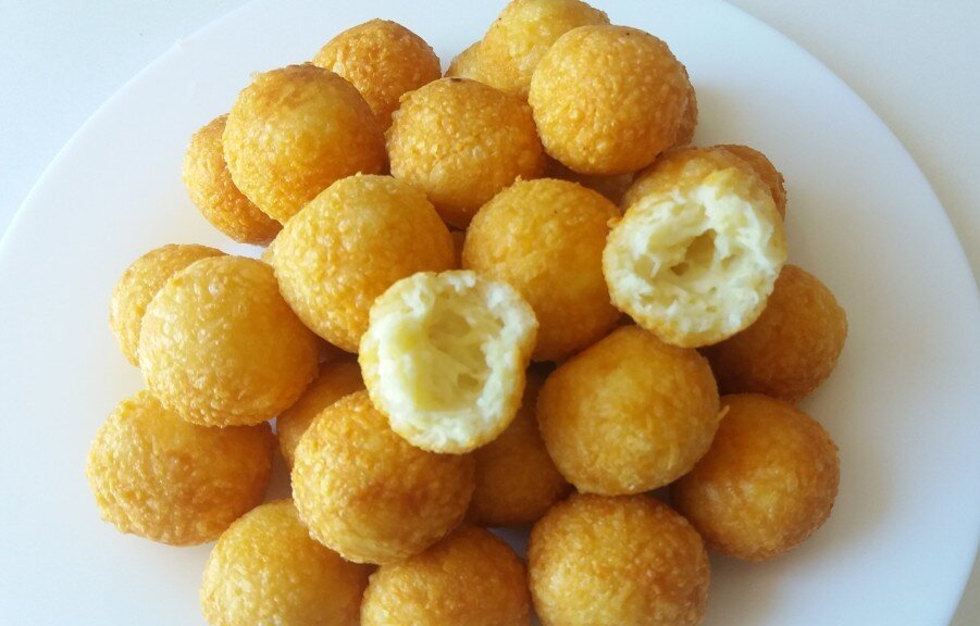 Хочу рассказать вам очень быстрый и вкусный рецепт тянущихся сырных шариков, как из ресторана! Подавать их лучше горячими, так как тогда они будут тянуться :) Ингредиенты: ♡ Сыр твердых сортов (Российский) -400 гр. ♡ Куриное яйцо - 6 шт. ♡ Кукурузные хлопья (не сладкие) - 1 стакан (или панировочные сухари) ♡ Мука высшего сорта - 6 ст.л. ♡ Растительное масло (для жарки, около 500 мл) ♡ Соль В результате получится около 25 шариков! Рецепт: ★ Возьмите глубокую емкость и мелко натрите сыр ★ Отделите белки от желтков, добавьте щепотку соли ★ Взбейте белки в крепкую пену (около 3 минут), ★ Просейте муку к белкам ★ Перемешайте и добавьте сыр ★ При помощи чайной ложки вытаскивайте массу и лепите из нее шарики ★ Аккуратно обваляйте все шарики в панировке ★ Налейте масло в кастрюлю, дождитесь кипения и опустите шарики Шарики должны плавать в масле ★ Дождавшись кипения масла в кастрюле проверьте готовность, бросив кусочек мякоти хлеба, который станет золотистым, либо немного