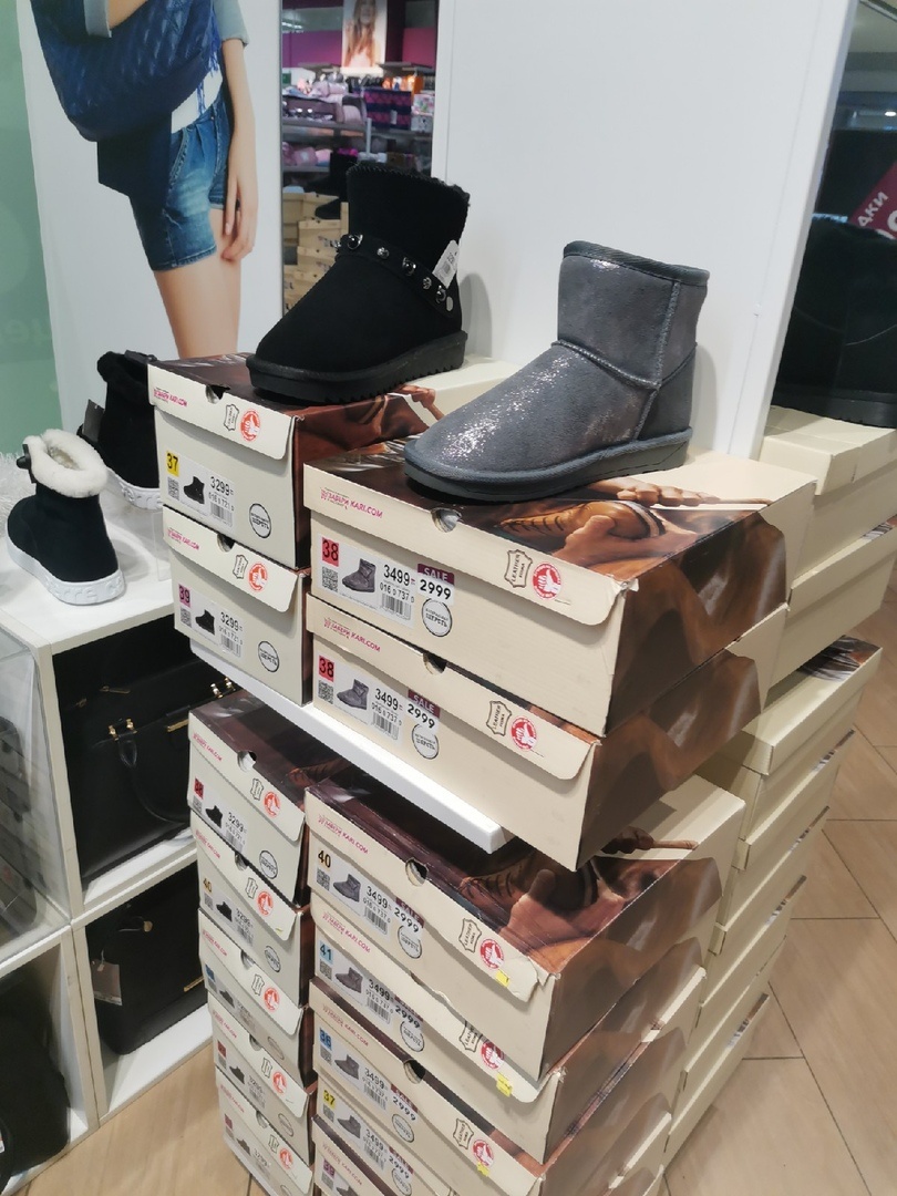 Интересно, не пора ли, говоря о "Kari", называть его магазином постоянных распродаж, ибо каждый раз, когда я сюда захожу, у меня перед глазами коробки с наклеенными стикерами распродажи. Да и говорить тут особо не о чем - обзоры на новую коллекцию и скидки, потому что о качестве уже давно каждый сделал свои выводы. Я в свое время потратила здесь довольно крупную сумму, покупая сапоги и ботинки на осень-зиму-весну, но все они были недолговечными, а угги за 700 рублей я вновь достала из шкафа и уже ношу при прогулках, с ними никаких проблем. Покупала я угги в прошлом году и тогда "Кари" предлагал два варианта - обычные и кожаные. Среди каждого вида было по три цвета, но в целом выбор не сказать, что большой. Зато в этом году произошло что непонятное - в новом завозе то и дело мелькают угги, я в принципе не помню, когда видела их в таком количестве: Причем эти угги как только не модернизировали - и ремешки им повесили, и разные цвета сделали, и всякие пушистые декорации. В общем все, чтоб