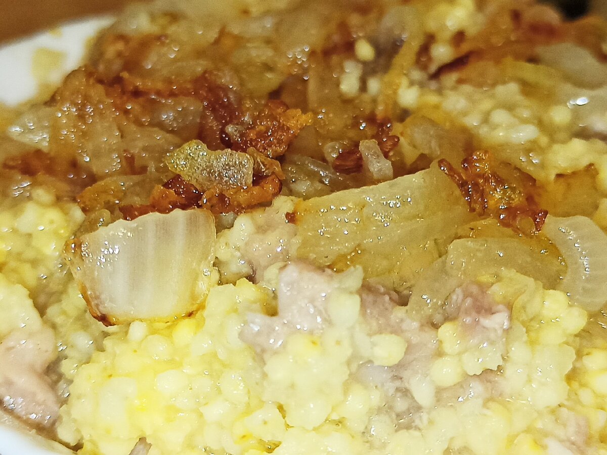 Всем вечер добрый! Иногда нам всем хочется что то вкусное и не обычное,но совсем простое! И так это рецеп больше рыбацко-походный! Приступим! Заливаем 2 стакана пшена кипятком и промываем,кипятком для того чтобы вымать из пшена горькое масло и блюдо не горчило! дальше наливаем кипяток,столько чтобы выше каши было 4-5 см воды и ставим на медленный огонь и часто помешивая варим минут 5,не забываем про соль.После добовляем тушонку и всё перемешиваем! В то время пока каша варится нарезаем и поджариваем лук на сливочном масле,до золотистого цвета! Лук можно смешать с кашей или просто красиво положить на кашку уже в тарелки!Поверьте это простое,но очень вкусноё блюдо!!!!!