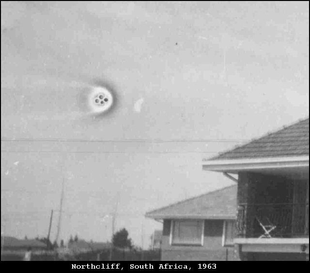 Здравствуйте! Сегодня я хотел бы познакомить вас, наверное, с одними из самых ярких старинных фотографий неопознанных летающих объектов, (которые, к слову, не так уж и изменились с тех пор... кроме первого снимка, таких я вообще никогда не видел). Итак, первая фотография в сегодняшнем списке была сделана одним неизвестным нам фотографом, в одном из городов Южной Африки (тогда на дворе стояло лето 1963-го). Делая фотографии домов для публикации в местной газете, агент по недвижимости случайно захватил этот странный летающий объект, который быстро пролетел над крышами зданий, но был успешно "пойман" ловким "стрелком". Как мы можем видеть по фото выше, яркая сфера (которая, в свою очередь, состоит из четырех черных или серых сфер) оставляет за собой странноватый след, который немного напоминает мне кильватерную струю (след, оставляемый кораблем на воде). А эта фотография была сделана неким Тревором Констеблем (17 мая 1958 года) подле местной достопримечательности Джайант Рок (это такой