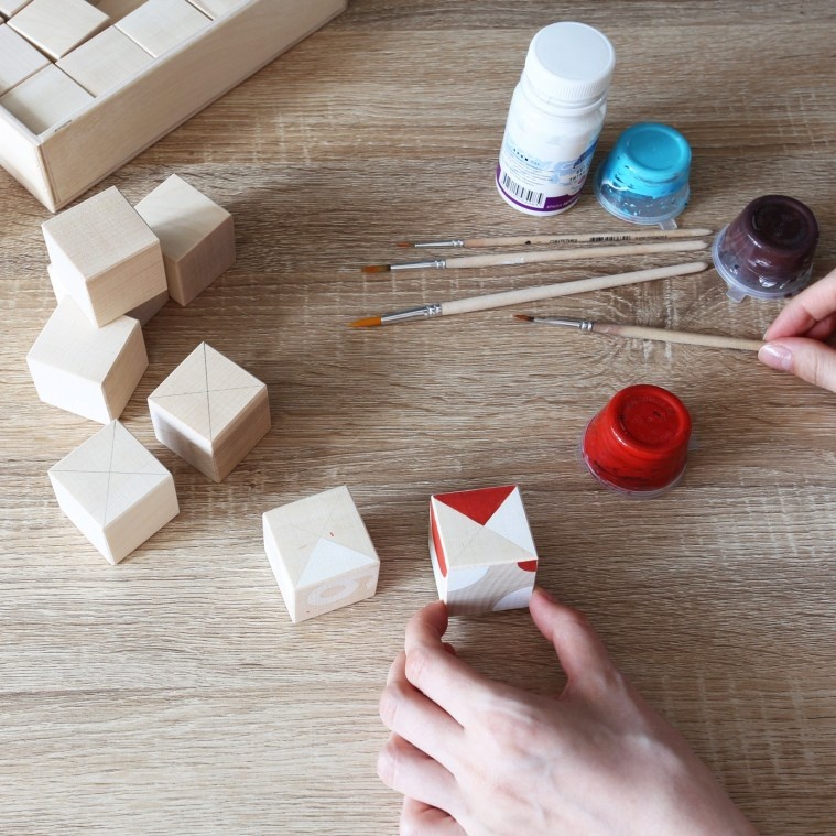 Сегодня вместе с творческой мамой, мы будем создавать увлекательную и развивающую игру — кубики. Это набор, который можно собирать разными способами и придумывать с ним различные задания. Все геометрические орнаменты, которые можно изобразить на кубиках, будут собираться в разном порядке, создавая все новые рисунки. Буквы, цифры, знаки препинания — фантазия не ограничена. Кубики Анны — пример, придуманный ею для своего сына. Вспомните, какие цвета и предметы нравятся вашему ребенку больше всего, и дерзайте! Что понадобится Шаг 1 Необходимо нанести карандашную разметку на кубики. Для геометрических форм можно использовать линейку или трафареты. Лучше предварительно сделать эскиз на бумаге, чтобы не запутаться в очередности сторон. Каждую из шести сторон можно сделать с разным орнаментом, а можно все стороны покрасить однообразно. Линии нужно рисовать малозаметные, чтобы их легко перекрыла краска и стер ластик при необходимости. Шаг 2 Начиная с самого светлого цвета поочередно наносим
