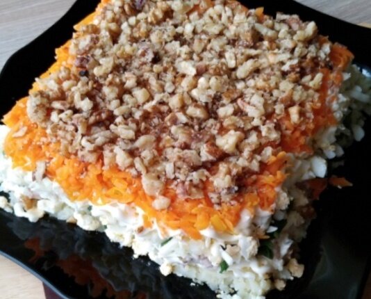 Предлагаю рецепт салата в копилку для праздничного стола. Салат "Тихая гавань" готовится с печенью трески, так что от него будет не только вкусно, но и полезно! Ингредиенты: Готовим: Салат готовится слоями. 1) Картофель натереть на терке, затем слой майонеза. 2) Из консервов слить жидкость, выложить кусочки печени в тарелку и размять вилкой. Выложить следующим слоем. 3) Лук нарезать и выложить поверх печени. 4) Плавленный сыр натереть на терке. Чтобы этот процесс не вызвал затруднений, предварительно положите сыр в морозилку. Выложим слой сыра. 5) Яйца очистить и натереть на терке, выложить поверх слоя сыра, смазать майонезом. 6) Яблоко очистить от кожуры, натереть на терке, выложить слой, сбрызнуть лимонным соком. 7) Затем слой тертой моркови, который также следует смазать майонезом. 8) И, наконец, заключительный слой - рубленые грецкие орехи. Предварительно орехи можно обжарить на сухой сковороде. Поставить салат в холодильник для пропитки.