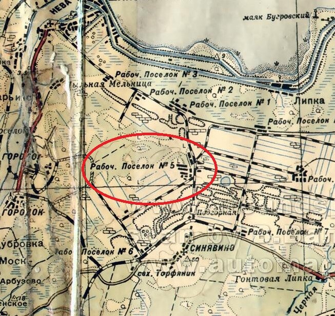Многие знают знаменитый исторический снимок "встреча Волховского и Ленинградского фронтов". Я помню его еще по старым школьным учебникам. В разных источниках встречается информация, что этот снимок был сделан у рабочего поселка № 1, но это не так. Это снимок сделан в рабочем поселке № 5. Что же это за рабочие поселки? Всего их было 7. Это были поселки для проживания рабочих, занятых на добыче торфа. Торф служил топливом для недавно построенной ГРЭС на берегу Невы в Кировске. 5 поселок был, так сказать центровым. Здесь располагались школа, клуб, больница. Жилыми домами, как и в других поселках, были одно и двухэтажные бараки. Добыча торфа была в то время перспективным направлением. Для сокращения ручного труда и увеличения объемов добычи, при 5 поселке был создан Всесоюзный научно-исследовательский институт механизации торфяной промышленности (ВИМТ). К 1941 г. была подготовлена вся необходимая инфраструктура для