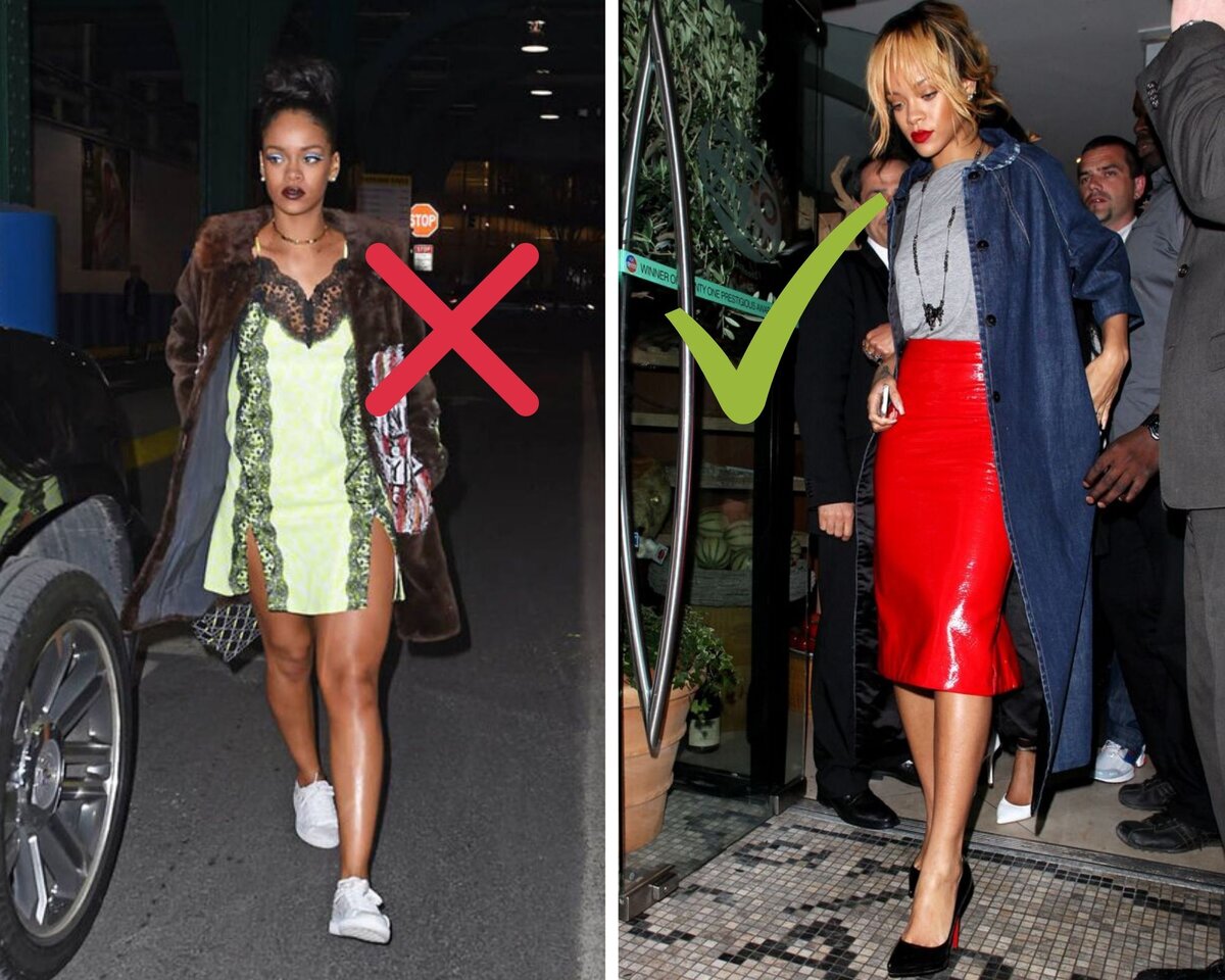 Иногда силуэт расплывается, и в этом виноват не пончик, неосторожно съеденный на ночь. Лишних килограммов могут добавить неприметные детали в одежде. Рассказываем, какие ошибки приводят к «визуальной» полноте. 1. Супер мини Супер мини юбка вряд ли добавит кому-то очарования. Особенно — с разрезами на боках как у Рианны. Беда такой модели в том, что она открывает самую полную часть ноги и делает на ней акцент. А чтобы выглядеть стройнее, нужно делать наоборот. Например, показать изящные лодыжки и спрятать пышные бедра. Как это сделать, можно посмотреть на фото справа. 2. Горизонтальные полосы При росте в 179 см Кендалл Дженнер весит всего 54 килограмма. Но и она может выглядеть полнее, чем на самом деле. Виной тому — горизонтальная полоска, которая расширяет фигуру. К тому же такой принт визуально "рубит" тело на части, лишая его гармонии. Если хочется выглядеть стройнее, откажитесь от горизонтальной полоски в пользу вертикальной. Или носите однотонные платья. 3. Баска Платья с баской
