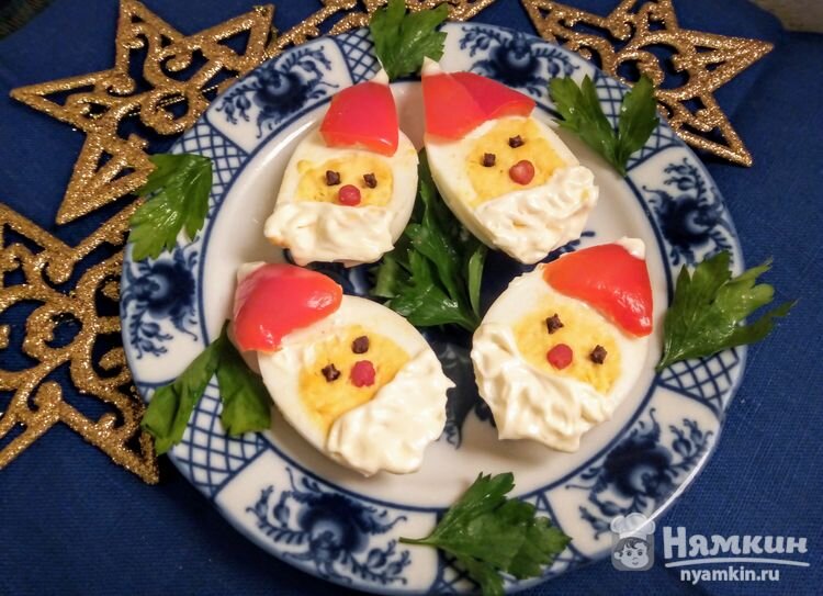 Новогодняя закуска Дед Мороз Новогодние закуски хочется сделать не только вкусными, но и красивыми, чтобы создать праздничное настроение. Предлагаю вам рецепт новогодней закуски Дед Мороз, в приготовлении которой нет ничего сложного, а выглядит она ярко и оригинально. Давайте приготовим вместе! Ингредиенты:- яйца куриные