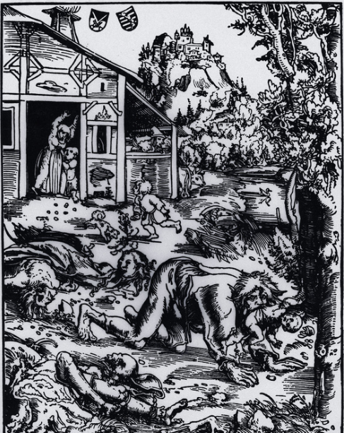 Легенды о вампирах родом из Восточной Европы, чудовище Франкенштейна было создано Мэри Шелли, а страшные истории об оживших мумиях появились в викторианской Англии. Оборотни же – это западноевропейский фольклор, а также древнейшие художественные ассоциации. На этой гравюре 16-го века, созданной одним из величайших художников эпохи Возрождения, изображен оборотень, терроризирующий немецких жителей почти 500 лет назад. Одичавший человек, ползающий на четвереньках вышел из леса, чтобы отведать человеческую плоть. Возможно в основе этой гравюры лежит правда и это больной бешенством. Это уже не важно, для тех времени это был монстр.