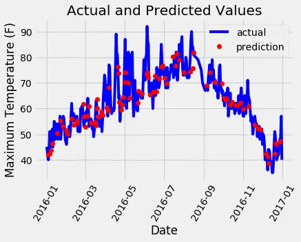 К данному моменту мы уже рассмотрели почти все необходимое для базовой реализации Random forest при решении задачи контролируемой регрессии. Теперь можем быть уверены, что наша модель может прогнозировать максимальную температуру на следующий день с точностью 94% на основе годовых исторических данных. Поиграйте на этом примере или используйте модель в наборе данных по своему выбору. Завершу этот пост, показав несколько визуализаций. У меня две любимые части науки о данных — это графика и моделирование, поэтому, естественно, я должен построить диаграммы! Кроме того, что на диаграммы просто приятным смотреть, они могут помочь диагностировать используемую модель, потому что они в легко воспринимаемом глазом изображении вмещают огромное количество чисел.