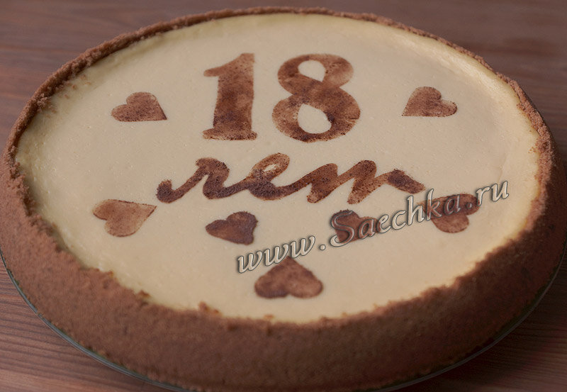 - На следующий день с помощью любого редактора напечатать для украшения торта цифры «18 лет» нужного шрифта и размера, вырезать маникюрными ножницами, выложить на поверхность чизкейка и присыпать какао: