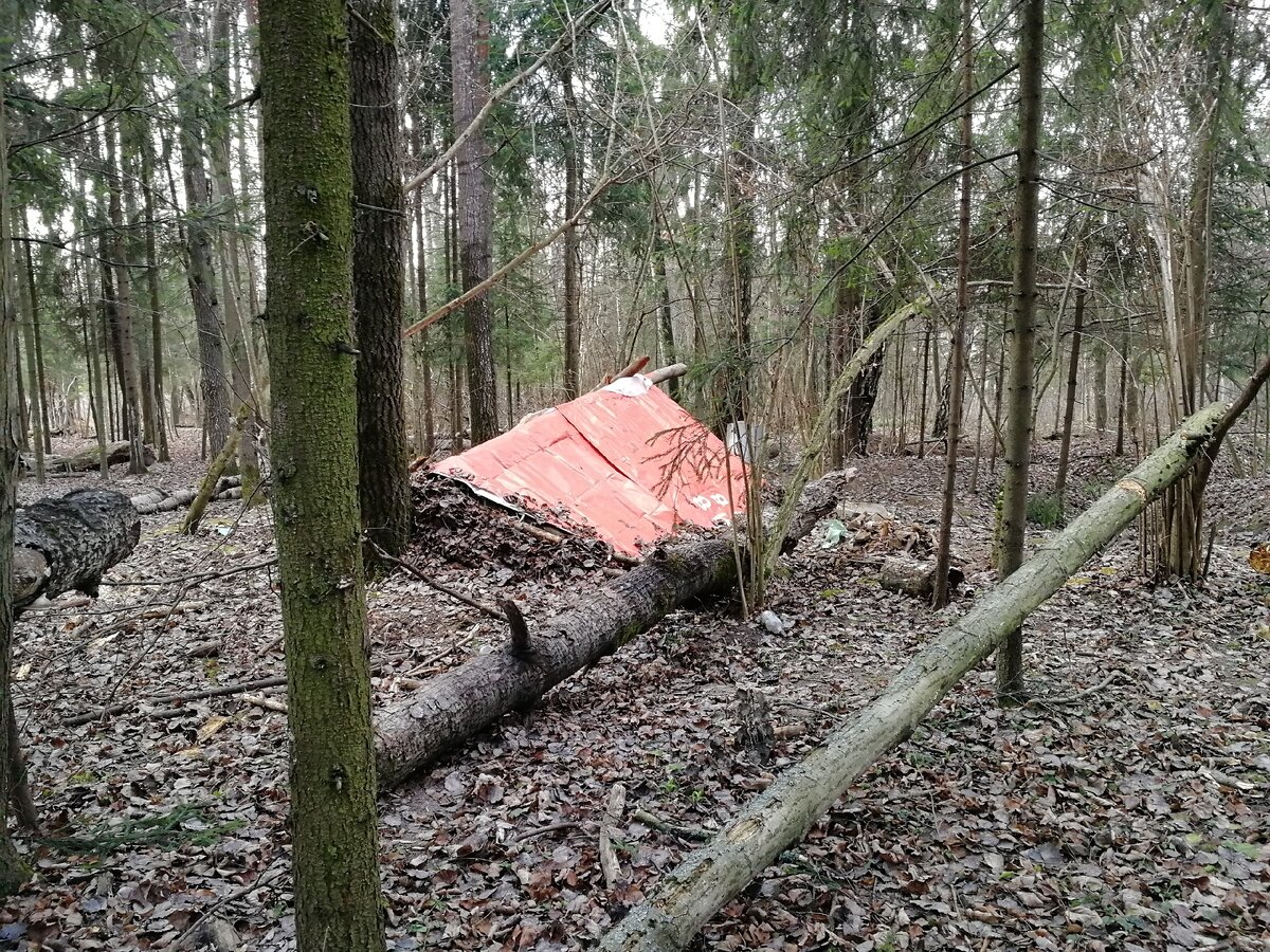 Единственное время поздней осенью, когда можно пробежаться в свое удовольствие в лесу и при свете дня, это выходные. В этот раз немного увеличил дистанцию и нагрузку, для чего стал петлять по различным тропинкам и совершенно случайно увидел какой-то оранжевый тент. Сначала подумал, что это кто-то на лето сделал удаленную точку для отдыха на природе. Однако, вблизи это оказалась довольно неплохо сделанная землянка. Крыша была накрыта виниловым тентом от какого-то рекламного банера и частично тканью парашюта . Вход прикрыт скромным по ширине, но длинным куском камуфлированной материи. Рядом с ним прямо из земли торчал свернутый в трубочку лист оцинкованного железа. По смыслу это должен был быть дымоход, но он был слишком мало закопченным и запах дыма был легким. Спустившись вниз, под пологом обнаружил помещение приблизительно 2,5 на 1,8 метра. Потолок высокий и позволяет ходить свободно в любой угол, а при желании еще и прыгать. Шучу. Но довольно просторно. Стены от пола до уровня зе