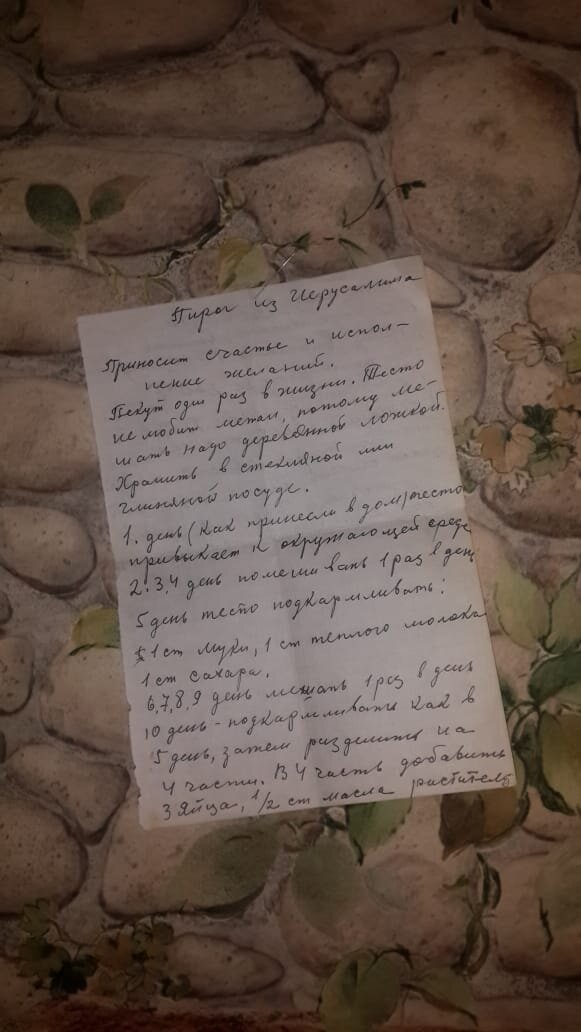 Добрый день, дорогие друзья! В этой статье я хочу поделиться с Вами счастьем. Очень вкусным счастьем. Этот рецепт попал ко мне совершенно случайно. Я перелистывал нашу старинную книгу рецептов, лежа на диване, как вдруг из нее выпал небольшой листок. Подняв его, я ощутил на ощупь, что бумага очень старая и формат листка явно не вписывается в современные размеры печатных изданий. Но, я отвлекся… Сверху листка скромно было написано название – «Пирог из Иерусалима». Следующая фраза, которая впоследствии заставила меня дочитать до конца – «Приносит счастье и исполнение желаний. Пекут один раз в жизни». Итак, собственно, рецепт: Ингредиенты : Мука - 9+2/3 стакана, Сахарный песок – 3 стакана, Молоко – 3 стакана, Растительное масло – 1 чайная ложка, Сода – ½ чайной ложки, Яйцо куриное (белое) – 2 шт. Первым делом нужно подготовить закваску. Очень важно соблюсти одно правило. Тесто не любит металл, поэтому мешать надо только деревянной ложкой и хранить в глиняной посуде. 1 день. Тесто привык