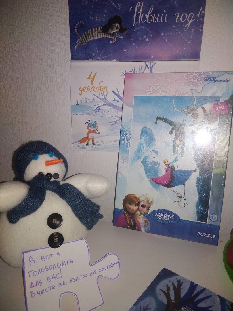 Все 3е декабря прошло в бегах. Бегала то с одной, то с другой. Дети раскрашивали раскраску по очереди и отложили, чтобы растянуть удовольствие. В принципе, мы всегда так делали - красили их потихонечку весь декабрь, а потом до марта восхищались живописью. Так что наберитесь терпения - покажу веселые картинки позже. А на сегодня Снеговик принес пазл с сюжетом из мультфильма "Холодное сердце". И, да, я знаю, что сейчас идет вторая часть. И наш папа даже купил нам билетики на утренний сеанс, так что, когда мальчики уйдут на работу и тренировку, мы с девочками пойдем в кино. Не переживайте за старшего, они с папой потом вдвоем сходят на что-то там свое для мальчиков, вроде на Звездные войны собирались. В уже далеком 2015м, мы ходили на "Снежную битву" - ремейк канадского фильма "Собака, остановившая войну" (1984). И, конечно, в декабре мы много смотрим советских и не только, новогодних и рождественских фильмов и мультфильмов. Ну, или, вот, про зиму, например. Наш декабрьский список пример