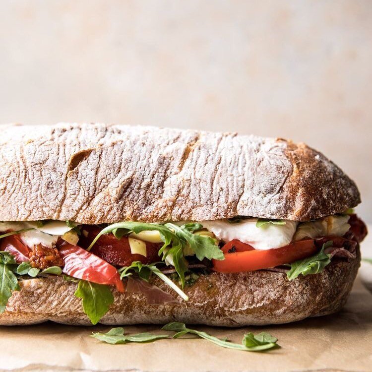 10 ингредиентов. ВСЕГО-ТО 😋 СОСТАВ 1 буханка чиабатты, разрезанная вдоль пополам 1/2 стакана базиликового песто 6 ломтиков прошутто 1 стакан маринованных артишоков 1 обжаренный красный перец, нарезанный ломтиками 1/2 стакана масла фасованных вяленых помидоров 8 ломтиков свежей моцареллы 4 ломтика твёрдого сыра 1 горсть рукколы Я надеюсь, что вам по вкусу мои рецепты. Делитесь впечатлениями 🙌🏼