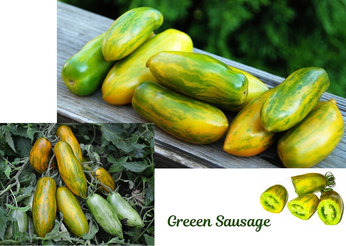 Насмотревшись в Instagram фото многочисленных томатных экзотов, которыми с гордостью хвастались коллекционеры и любители-томатоводы, я тоже «заболела» желанием посадить на своём огороде что-то подобное. Интересно ведь, каковы на вкус плоды, которые никогда и нигде раньше не видела. Именно таким, заморским чудом, мне показался сорт Green Sausage – «Зелёная сосиска». Название говорит само за себя. Плоды непривычно удлинённые - от 6 до 12 см. Окраска тоже далека от традиционной – это зеленоплодный сорт с желтыми вкраплениями вдоль всей длины плода. И хотя сорт совсем не нов, его вывели в конце 90-х годов, мне он нигде ранее не встречался. Выглядит он очень декоративно и привлекательно. Семена нашла в частной коллекции, купила, посеяла. Да, это и в самом деле интересный сорт во многих отношениях. Листочки томата узенькие, удлинённые, а куст – практически стелющийся по земле – его высота всего около 30 см. Я дала кустам этого сорта расти так, как им вздумается. Никакого пасынкования не п