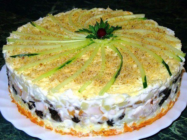 ЗАКУСОЧНЫЙ ТОРТ с копчёной курицей, черносливом и шампиньонами Ингредиенты: — копчёная курица – 400 г — чернослив – 100-150 г — грецкие орехи – 100 г — морковь – 2 шт. — картофель – 4 шт. — яйца – 4 шт. — сыр (твёрдый) – 300 г — шампиньоны – 250 г — 1 ст. л. растительного масла для жарки шампиньонов — соль — майонез или подсоленная и сдобренная специями густая сметана Для украшения: — половина свежего огурца — 3 ст. л. хорошо измельчённых грецких орехов — веточка петрушки — 1 ягода клюквы Приготовление: Яйца отварить до готовности, охладить, очистить и натереть на мелкой тёрке. Картофель и морковь вымыть, отварить до готовности, охладить и очистить. Морковь натереть на крупной тёрке, картофель нарезать маленькими кубиками. Шампиньоны вымыть, обсушить, мелко нарезать. В сковороде разогреть растительное масло, обжарить шампиньоны (около 7 минут), в конце жарки посолить. Жареные шампиньоны охладить. Чернослив вымыть, хорошо обсушить, нарезать маленькими кубиками (если чернослив слишком су
