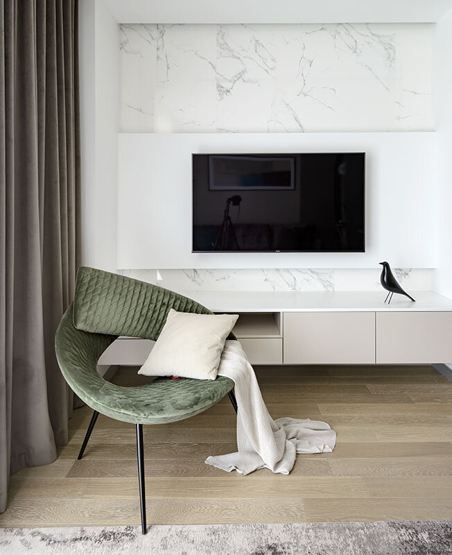 Кирилл Дунаев и Анна Астафьева, «Дизайн-бюро № 11», оформили квартиру 57 кв. метров. В противовес своему активному образу жизни заказчица хотела лаконичный, спокойный по настроению и атмосфере интерьер. Исходное пространство было относительно темным — окна квартиры выходят на запад. Перед дизайнерами стояла задача создать максимально светлый, наполненный воздухом интерьер и разместить все необходимое для комфортного проживания. Авторы провели незначительную перепланировку: немного увеличили пространство гостиной за счет площади спальни. В образовавшуюся нишу вписали ТВ-зону с подвесной тумбой. Немного сдвинули простенок между ванной и гардеробной на толщину инсталляции, придав ванной комнате правильную прямоугольную форму. «Мы хотели создать легкий интерьер для жизни, — рассказывают Кирилл и Анна. — На решение задачи работают зеркальные и глянцевые поверхности, прозрачная мебель и предметы на тонких ножках. Три двери в прихожей постарались максимально растворить в пространстве. Полот