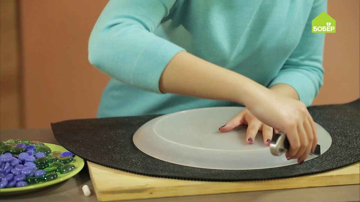 С помощью клеевого пистолета приклейте плитки и камушки к резиновому основанию.