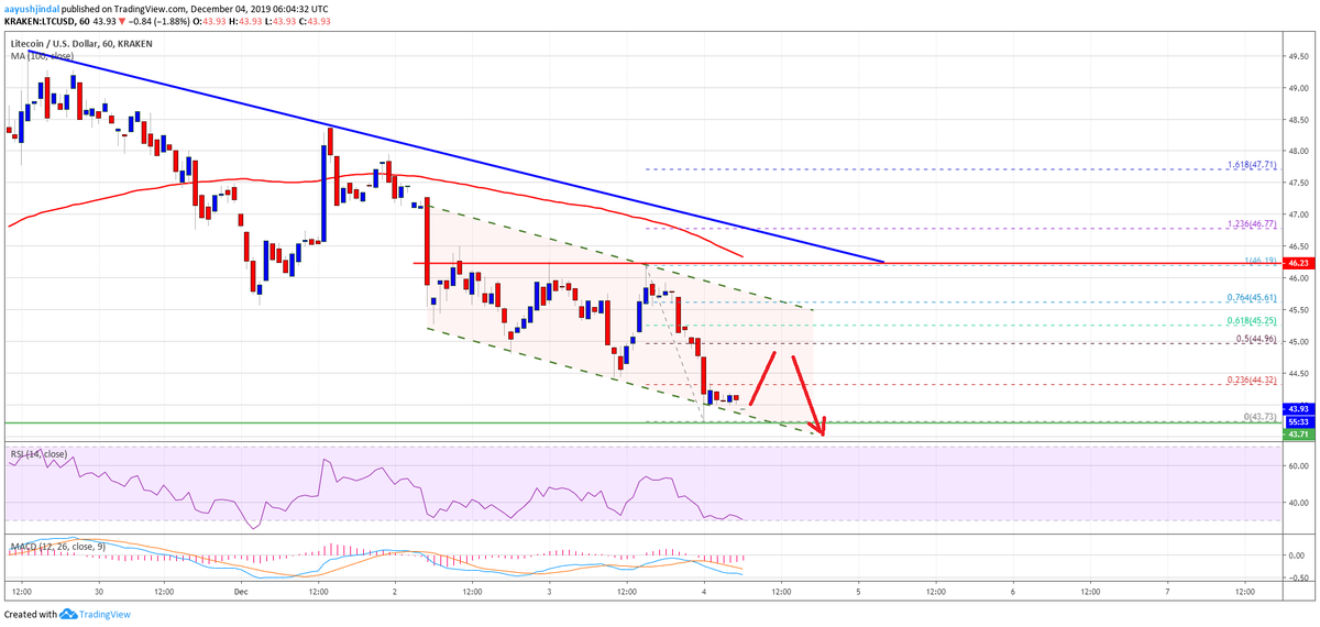 Если и произойдет коррекция вверх выше $44,40, цена LTC может скорректироваться в сторону сопротивления $45,00, представляющий собой уровень коррекции Фибоначчи 50% недавнего снижения с максимума $46,19 до минимума $43,73.