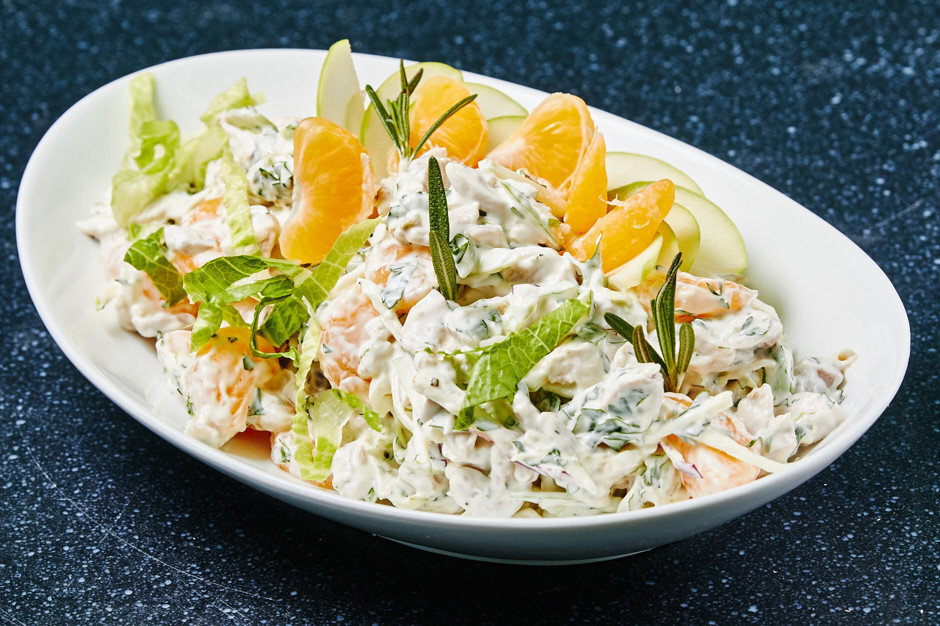 Новый Год один из самых любимых праздников в каждой семье. Но это еще и самое длинное по времени, торжество. Поэтому на столе должно быть много разной закуски. И очень хорошо, когда угощение будет необычное, новое – каждой хозяйке приятно не только вкусно готовить, но и удивлять своих родных и друзей. Предлагаем яркое по оформлению блюдо, с отличными вкусовыми качествами, и прекрасным калорийным составом. САЛАТ «НОВОГОДНИЙ» Для приготовления блюда необходимы следующие продукты: курица – половина тушки; мандарины и апельсины – по 2 шт.; яблоки – 2 или 3 шт.; чернослив – 80 гр.; яйца – 3 шт.; морковь – 2 шт.; консервированный зеленый горошек – 3 столовые ложки; песок сахарный – 1 чайная ложка; майонез – 4 столовые ложки (по вкусу); сметана – 2 столовые ложки (по желанию); соль – по вкусу; сок одного лимона (по желанию) – ½. Курятину предварительно моют и отваривают, затем остужают. Яйца, морковь отваривают. Сухофрукты, ф
