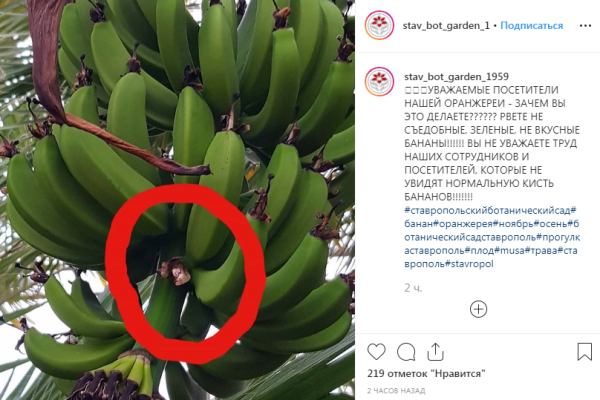 Сотрудник ставропольского ботанического сада имени В.В. Скрипчинского сообщил радиостанции «Говорит Москва», что на такие меры они вынуждены пойти из-за посетителей, которые срывают зелёные бананы. «Табличку повесим. Всё сделаем». Сегодня в Instagram на странице ботсада опубликован пост с жалобами на посетителей оранжереи, которые срывают незрелые бананы.