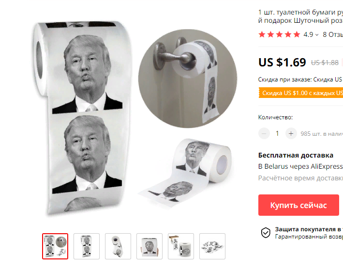 Добрый день, мои читатели и подпикусы:) Сегодня мы с Вами поговорим и увидим странные товары с известного всем сайта Aliexpress. И также попробуем решить, нужли ли данные товары в обиходе повседневной жизни, или это просто приколюшечки.... Начнем-с! 1. Туалетная бумага с лицом Трампа На самом деле очень прикольная задумка, но при цене в 1,69 $ особо не поприкалываешься. 2. Набор милых игрушек-пенисов Не знаю как Вам но меня действительно умиляет эта игрушка, и я бы ее купила) пока не понимаю зачем, но почему-то очень хочется. Как я понимаю, продается в комплекте, т.е. за 3$ ты получишь 5 штук! 3. Реалистичная какашка Какашка действительно очень реалистичная, но в комментариях написано, что она очень маленькая и на человеческую не похожа. Приезжает без запаха и тянется. Считаю ее бесполезной! 4. Плюшевые игрушки в виде человеческих голых тел Ну я считаю, что это не очень. Приходят к тебе в гости, а у тебя на подушке лежит такое! Я бы не покупала! И на последок! 5. Колготки для за