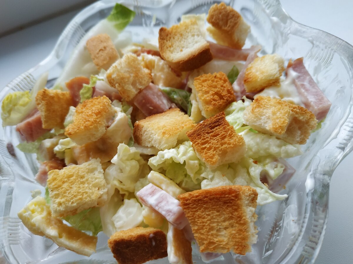 В конце, получаем отдельные части, которые соединяем перед подачей. Нашу смесь буженина, блинчики из яйца, пекинская капуста заправляем майонезом, подсаливаем и всыпаем наши золотистые и хрустящие сухарики!