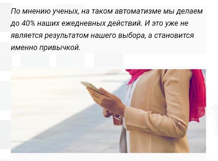 Мы живем в мире своих отрицательных привычек?Мы хотим от них избавиться, но они почему-то все равно руководят нашей жизнью? Что такое привычка? Если мы всего лишь несколько раз выполнили какое-то действие, то оно сразу же формируется у нас в привычку. Впоследствии такие действия мы делаем автоматически. Виды привычек: ✅положительные привычки ❌отрицательные привычки Положительные привычки-это например, чистка зубов, душ, одевание одежды, составляют привычный распорядок нашей ежедневной жизни. Однако отрицательные привычки приносят нам больше вреда, чем пользы. К ним относятся привычки не заниматься спортом, поздно ложиться спать, есть вредную пищу и так далее. При этом часто человек хочет отказаться от вредных привычек и иметь больше положительных, но у него ничего не получается. Не случайно, привычку называют второй натурой. Как формируются и действуют привычки? Все наши привычки формируются по одному и тому же механизму. Первым делом для запуска механизма привычки нужен какой-то