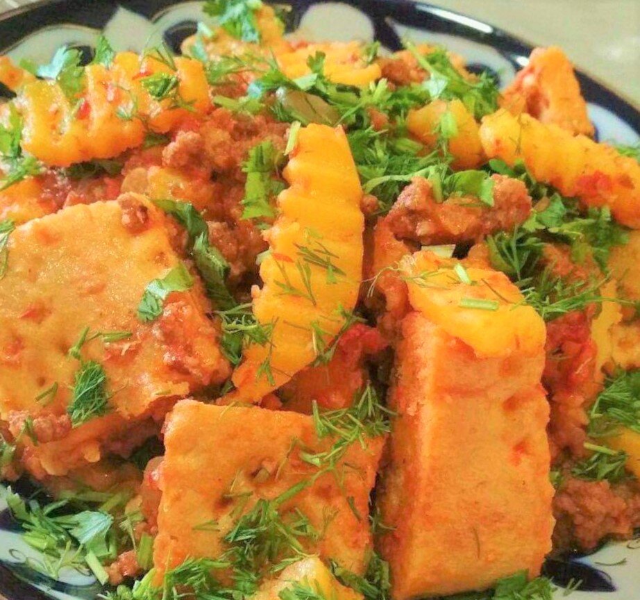 И так сегодня хочу поделиться с вами рецептом очень лёгкого, вкусного и сытного блюда. "Нон бости" или "Нон жаркоп", его по разному называют. А готовят его из лепёшек. Состав 300 гр мяса 1-2 шт картофеля 2 шт луковицы 1 шт морковь 1 шт перец болгарский 2 шт помидора или томатная паста Соль перец специи по вкусу Зелень: кинза, укроп по пол пучка 50 мл растительного масла Лепешка Приготовление В казан влить масло и разогреть. Мясо режем на небольшие куски, слегка обжариваем. Добавляем лук порезанный полукольцами и жарим 3 - 4 мин до золотистого цвета. И по очереди один за другим добавляем перец болгарский, морковь, картофель и помидоры, нарезанные небольшими кубиками. Все ингредиенты, перемешивая, жарим на среднем огне. По вкусу добавляем специи: соль, перец молотый лавровый лист, и заливаем кипятком, чтобы наши овощи с мясом закрылись на два пальца. На маленьком огне тушим до готовности овощей. Лепешку лучше предварительно высушить в духовке( сделать ) сухари), нужно порезать