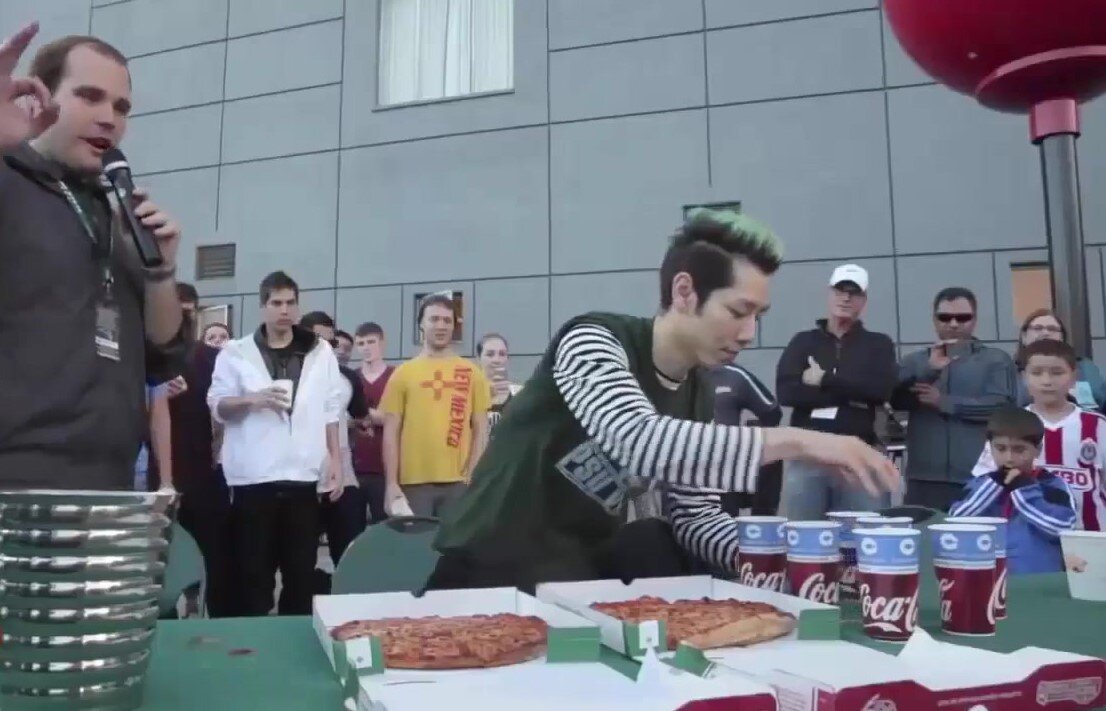 Аппетитного вечера друзья, все мы любим поесть вкусно и красиво, кто-то много, а кто-то листик салата в день, у кого-то одно пирожное приходится изгонять неделю в спорт зале из себя, а кто-то обладает стремительным метаболизмом который не только позволяет есть что хочешь, но и ставить рекорды гиннесса. Хочу вам представить Такеру Кобаяши, этот уникум имеет помимо множество рекордов в соревнованиях по поеданию различных блюд ( хот-доги, фрикадельки, гамбургеры, пиццы, мороженное и т.д. и т.п.) так ещё и 15 мировых рекордов гиннесса. Он родом из Нагано (Япония) родился в 1975 году и уже в 2001-ом выиграл свой первый конкурс съев 50 хот-догов за 12 минут. Так же он выигрывал этот конкурс ещё 6 лет подряд, в 2006 году он установил мировой рекорд съев 58 сосисок за 10 мин. Летом 2009 года на благотворительном соревнование в Пуэрто - Рико Такеру умял 64 тако за 15 мин. ещё поразить людей ему посчастливилось в 2014 году в Канаде где он установил мировой рекорд на конкурсе по поеданию пиццы,