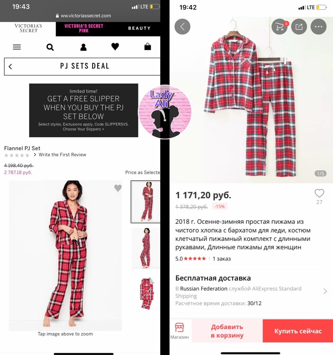 Привет, девчата! Многие из моих постоянных читательниц (а вас всё больше!) знают, что у меня есть цикл статей, посвященных брендовым товарам Zara, которые я нахожу на AliExpress. Ну что же, я предлагаю не ограничиваться одним брендом и разоблачить ещё парочку крупных модных корпораций! Сегодня я задалась задачей поискать для вас очень крутые вещи Victoria's Secret по цене ниже брендовой в несколько раз. Давайте разбираться! P.S. Как обычно: слева - товары бренда, справа - AliExpress. 1. Тёплая пижама Стоимость потрясающе красивой новогодней пижамы (фото ниже) на официальном сайте Victoria's Secret - 4200 рублей. Сейчас, правда, у них вроде как скидка и за такую чудесную пижамку вам придется отдать 2800, что тоже слишком завышено, согласитесь? Итак, после довольно продолжительных поисков на AliExpress мне удалось найти эту же пижаму. Угадаете стоимость? Всего 1100 рублей! Продолжительными поиски были по причине того, что мультибренды стараются всячески скрыть факт того, что часть