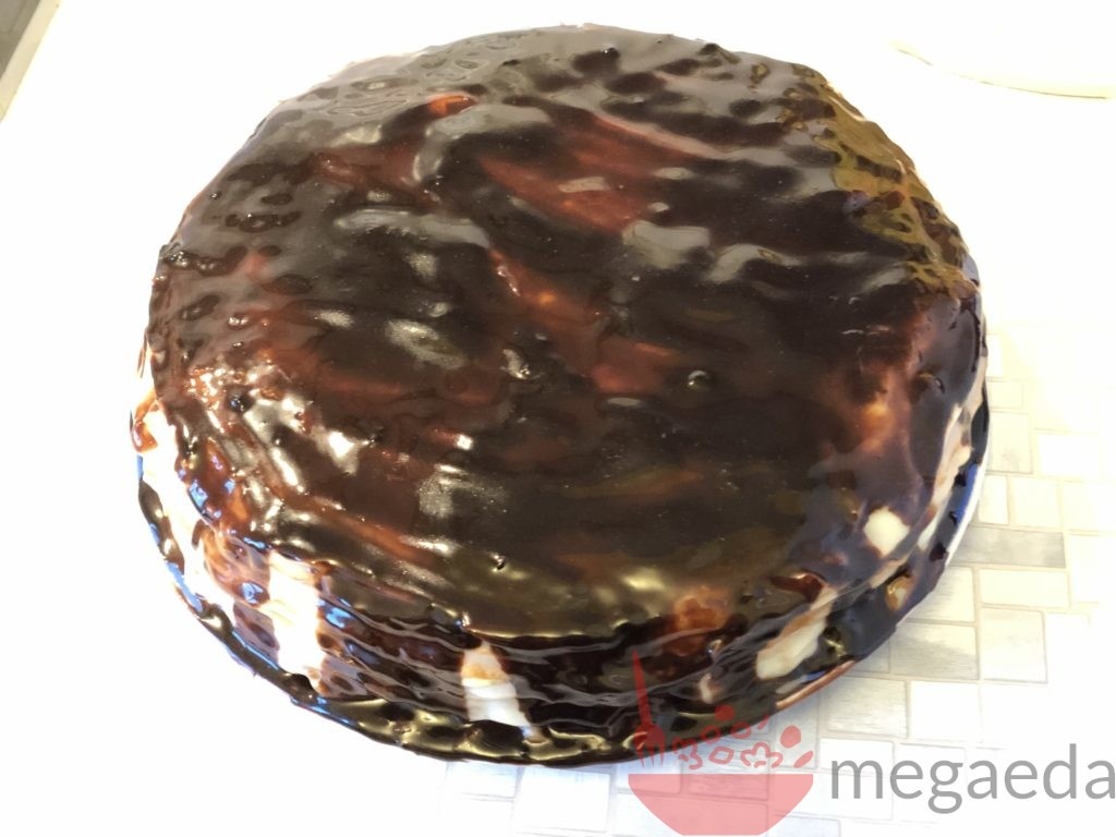 - Теперь приступаем к приготовлению глазури. Смешиваем все ингредиенты, ставим на медленный огонь и доводим до кипения. Заливаем торт горячей глазурью и ставим в холодильник.