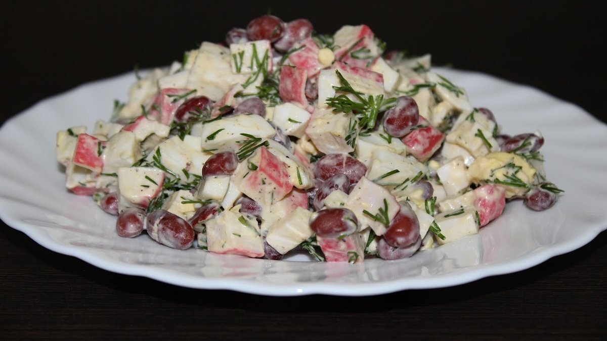 Сейчас мы приготовим с вами салат, который запросто можно поставить на новогодний стол. Он понравится и взрослым и детям и удивит своим вкусом. А теперь разберёмся с ингредиентами. Нам понадобится: - Фасоль в собственном соку (200 г) - Вареные яйца (2-3 шт.) - Крабовые палочки (200 г) - Сметана (для заправки) - Соль, перец (по вкусу) - Зелень (для украшения) Теперь можно приступить к процессу приготовления: Приготовление: Шаг 1 Открываем банку фасоли. Сливаем из нее весь сок. Высыпаем в тарелку Шаг 2 Крабовые палочки и яйца нарезаем кубиками и отправляем в ту же тарелку. Шаг 3 Все перемешиваем , солим, перчим по вкусу. Шаг 4 Заправляем сметаной. Шаг 5 Режем зелень и украшаем наш салат. Вот и готов наш простой, но вкусный салатик. Надеюсь вам понравился рецепт, жду ваших лайков и подписок. А так же пишите в комментарии какие блюда вы хотите увидеть у меня на канале, а что вам уже удалось приготовить по моим рецептам. Буду рада любой активности. Спасибо за внимание!