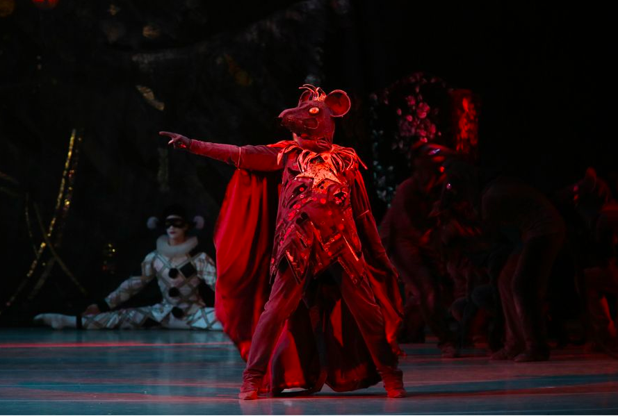 Как и задумано у Гофмана, сюжет сказки которого лежит в основе либретто спектакля, Мышиный король в нем - толстый монстр с семью головами, а Щелкунчик, победив его срывает одну из его корон: