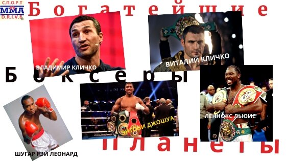 Привет любителям спорта и бокса! Сегодня осветим самых высоко оплачиваемых боксеров в мире! 10 и 9 место, делят Владимир Кличко и Энтони Джошуа. Кличко, уроженец Украины, выступавший с 1996 по 2017 год, состояние 60 000 000 $. Кличко был чемпионом в WBO, IBF, WBA? IBO...в весе свыше 91 кг выигрывал олимпиаду. Энтони Джошуа,единственный чемпион , в супер тяжелом весе, обладатель титула WBO, с 2018 г. Его состояние так же оценено 60 000 000 $, он провел более 100 боев и уступил лишь 3-м соперникам (в начале пути), однажды завоевал золотую Олимпийскую медаль. 8 место - Виталий Кличко, на сегодняшний день он уже не в спорте, состояние оценено в 80 000 000 $. Виталий рано увлекся боями, провел их 35 и проиграл 1 бой. 7 место - Шугар Рэй Леонард. - Американец, боксирующий оратор:)) завоевал титулы аж в 5-ти весовых категориях, талант, изящный в бою боксер, в его становлении учавствовал, бывший тренер Мухаммеда Али. Его состояние оценено в 120 000 000 $. 6 место - Леннокс Льюис - поединков