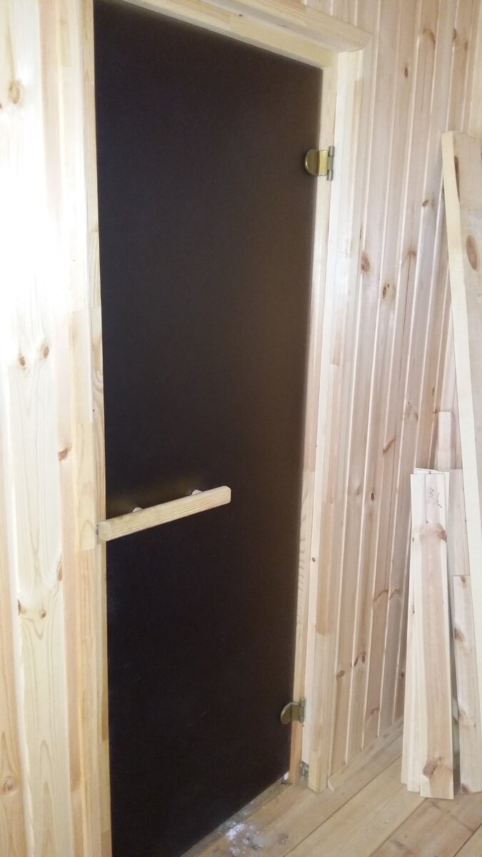 Есть такое мнение, что двери в бане обязательно должны быть из дерева. Возможно это так, при условии, что стоит качественная дверь, если же ставить дешевую то она не будет работать, должным образом. От резких перепадов температуры, эту дверь постоянно нужно будет дорабатывать, подтесать или шлифовать. Поэтому, лично мое мнение, дверь лучше всего ставить стеклянную, один раз смонтировал и забыл. Вот пример стеклянной двери, которая стоит 3 года и ни разу с ней ничего не делали. Покупали эту дверь в Леруа, на тот момент, там была самая лучшая цена. Магнит прижимает дверь, плотно. Петли не расшатаны. Уплотнитель на коробке не отвалился и не растрескался. Дверь стоит ровно, ее не повело и не перекосило, зазоры между дверным полотном и коробкой, такие же. Единственный недостаток этих дверей, это то, что при протопке парилки, если сразу не открыть двери, (в комнату отдыха или помывочную) то на ней образуется конденсат, который стекает на пол ручьем. Поэтому при растопке и последующей протоп