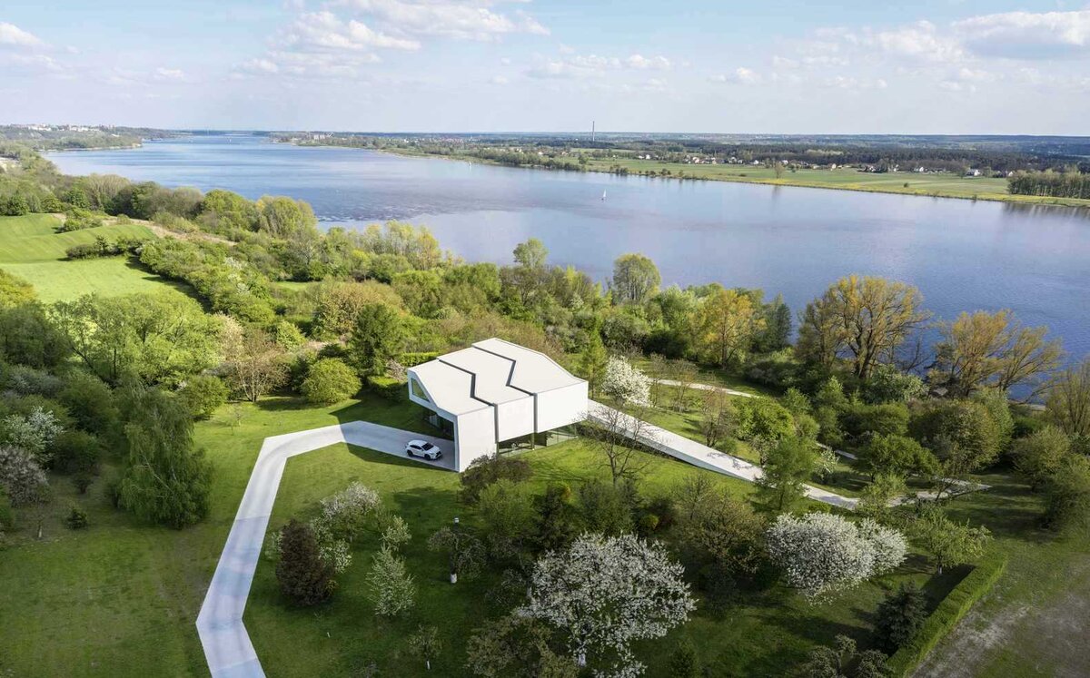 Оригинальный дизайн этого дома поражает воображение – дом полностью мимикрировал под окружающий ландшафт. Графически он стал частью дороги, которая пролегла на живописном берегу реки Висла в Польше. Причудливый ломаный маршрут дороги получил продолжение в архитектуре дома – здание как будто состоит из трех витков белоснежной ленты. Со всех ракурсов дом выглядит очень эффектно, но особенно впечатляет вид с высоты птичьего полета. Дорожное полотно становится частью конструктивных элементов дома. Оно отрывается от земли и трижды обвивается вокруг здания, образуя пол, стены и потолок, а затем снова раскручивается в ленту и тянется до берега реки. Благодаря этому торцы дома получились глухие – на них нет оконных проемов. Эта особенность с лихвой компенсируется полностью стеклянным передним и задним фасадами. Огромные панорамные окна позволяют солнечному свету проникать внутрь помещений, обеспечивая достаточный уровень инсоляции, а также потрясающий объем и легкость пространства. Окна р