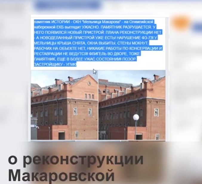 Жители города обеспокоены течением реконструкции Симановской Мельницы. «…крыша снята, окна выбиты , стены мокнут» - так пишут горожане о реконструкции. На вопросы нашей введущей ответил главный человек по реконструкции руководитель девелоперских проектов «УГМК Застройщик» Евгений Мордовин. С его слов строители приступили к работам по подготовке здания мельницы и лаборатории (здания флигеля во дворе) для современного использования. Оба объекта относятся к памятникам архитектуры. На первом этапе работы демонтированы перекрытия между первым и вторым этажом, кровля, окна. Это нормально, поскольку объектами охраны являются стены (фассады), окна (форма), и форма крыши. Все, что находится внутри относится к 40-ым, 50-ым, 80-ым годам, исторической ценности не представляют. Мельница была промышленным объектом, активно использующимся в жизни советского Свердловска, поэтому в 50-ых, 80-ых годах были сооружены множество пристроек, в том числе трансформаторная подстанция и дополнительный цех, кот