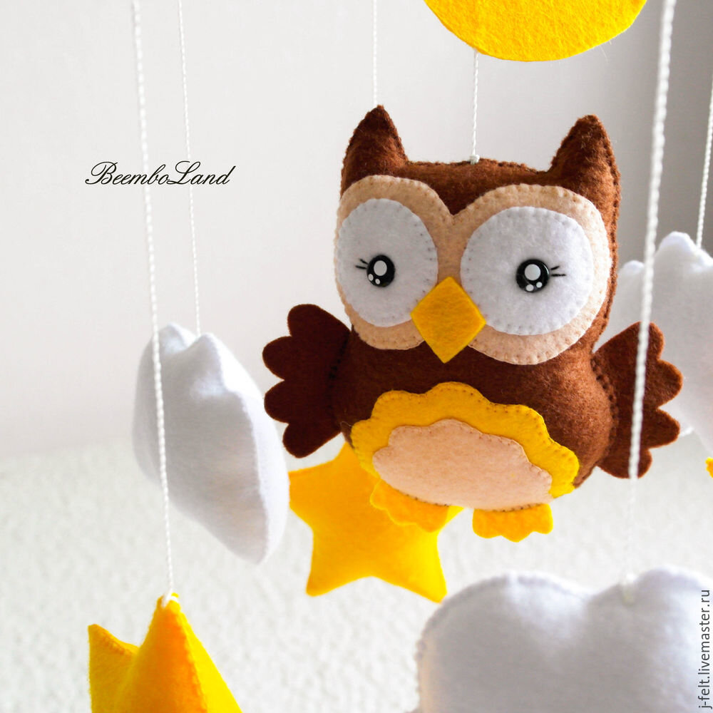 Прикрепите нитки ко всем игрушкам, а половинки Луны приклейте к нити над совой.
